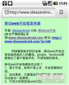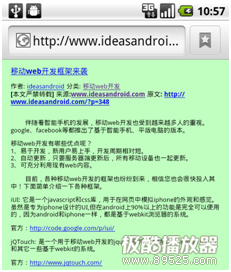 “viewport”,翻译为中文可以叫做“视区”,大家都知道移动设 备的屏幕一般都比PC小很多,webkit浏览器会将一个较大的“虚拟”窗口映射到移动设备的屏幕上,默认的虚拟窗口为980像素宽(目前大部分网站的标 准宽度),然后按一定的比例(3:1或2:1)进行缩放。也就是说当我们加载一个普通网页的时候,webkit会先以980像素的浏览器标准加载网页,然 后再缩小为490像素的宽度。注意这个缩小是一个全局缩小,也就是页面上的所有元素都会缩小。如下图所示,一个普通的文章页面在移动设备的效果: