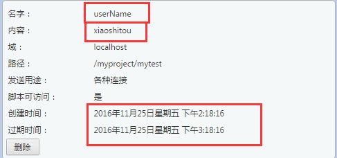 名字为userName,值为:xiaoshitou,保存时间为:1小时