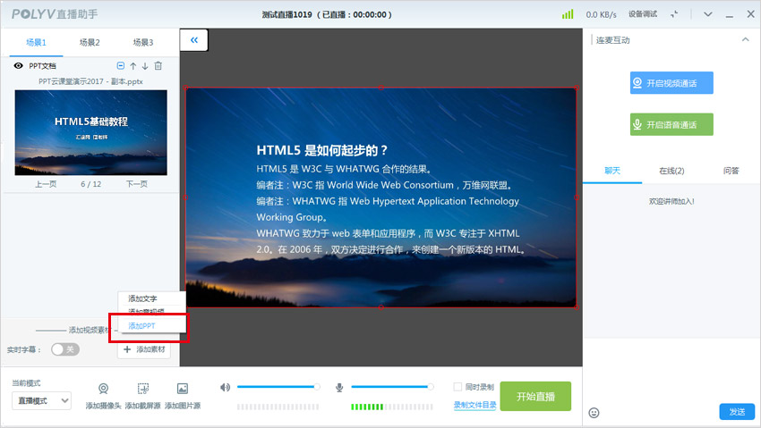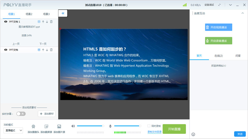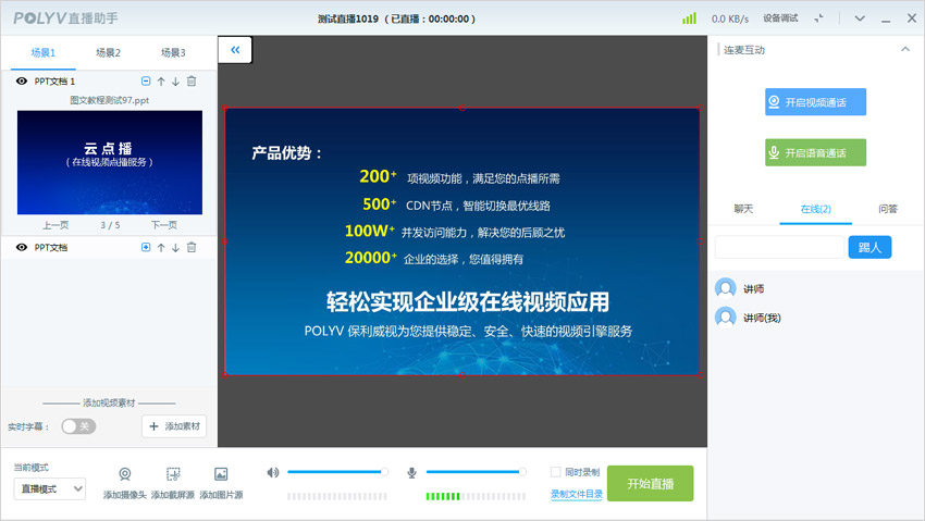 POLYV直播助手是一个配合POLYV直播平台,发起直播的工具,现在呢,新增了一个PPT文档功能,可以直接在直播界面中做PPT类课件直播,在线教学时这项功能特别有用哦,下面来说说这个功能吧。