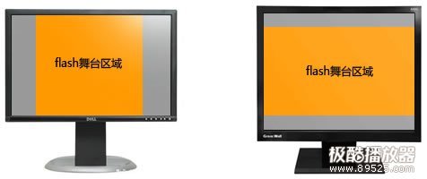 根据这些特性,我们制作的flash在全屏播放时有以下效果:由于生成的swf文件的长宽比固定,但客户端显示器分辨率多种多样,势必导致flash舞台区域外内容会显示在某些客户端显示器屏幕中。当swf文件是窄比例时,在宽屏显示器下,左右两边会出现舞台区域外内容;当swf文件是宽比例时,在窄屏显示器下,上下两端会出现舞台区域外内容。
