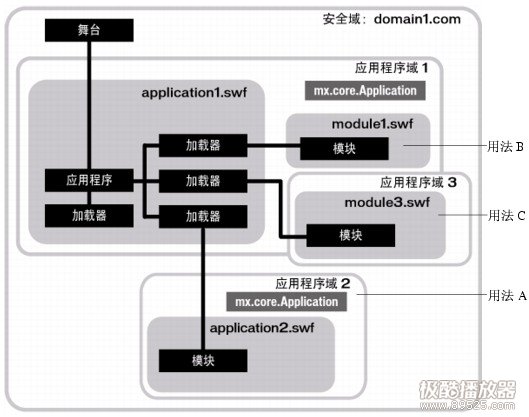 - 应用程序域 (Application domain):用于将不同 SWF 文件中使用的类分开的机制,以便在 SWF 文件包含具有相同名称的不同类时,这些类不会彼此覆盖。