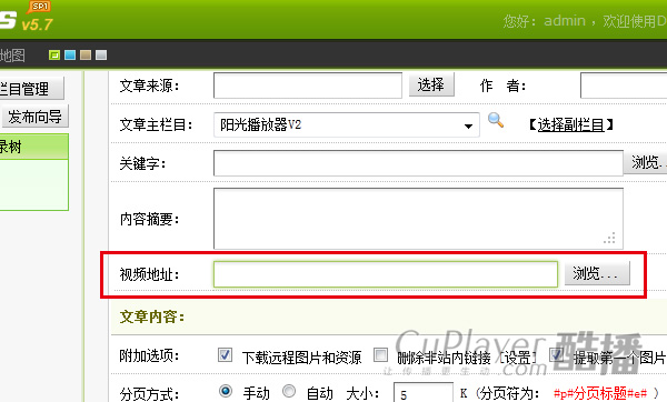 添加好了[视频地址]字段flvurl后,你再添加文章时,就会看到,视频地址字段已已经显示在面版中了,如下图: