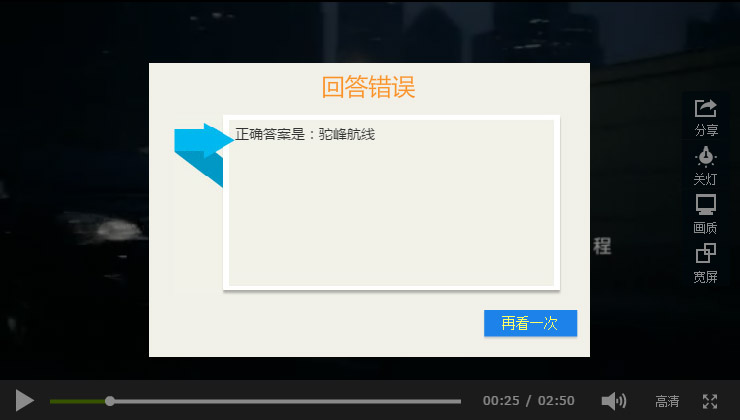 第4步:当用户回答正确时,则可以接着观看;当回答错误时,会弹出正确答案,如下图。