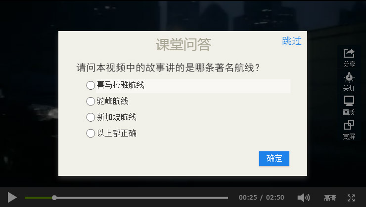 第3步:用户观看时的,当观看到设定的第25秒时,会弹出问答题目,效果如下图。