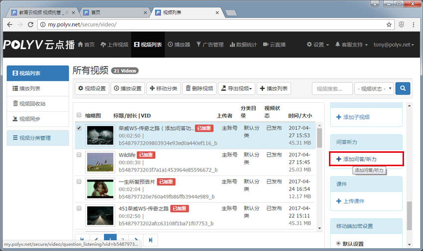 第1步:选中该视频后,再添加问答(如下图)。