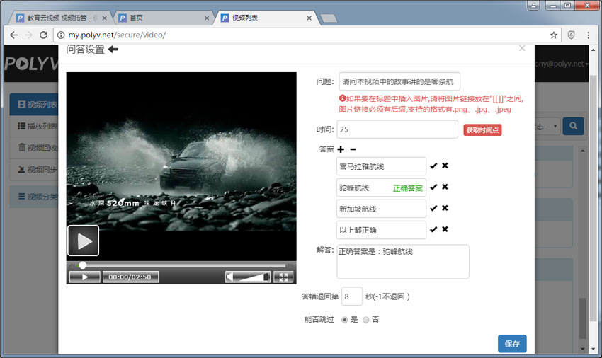 第2步:可以按视频本身的实际内容情况,设定对应的问题及答案(如下图),比如您设定第25秒时,弹出对应问答。