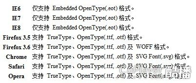 在网页中嵌入非系统自带字体,虽然技术上能实现,但是对国内来说,没有太大的实际意义,因为一个中文体文件起码20M+,而且各个浏览器支持的字体文件还都不一样,也就是说,在服务器端必须有2-3个不同格式的字体文件,用来应付各个浏览器,可以看下下面这张对应图。