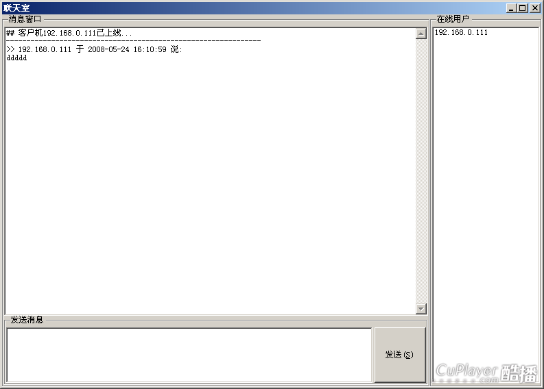 当启动ChatServer服务时,ChatServer将会在本地监听一个端口(默认为65432),并加入到"224.224.224.224"广播组.在这里大家要注意,"224.224.224.224"只是一个广播组标识,并不是网络上的某台机,也就是说这个IP地址并不存在的.这样做的目的,主要是向交换机或路由申请将你的机注册为"224.224.224.224" 广播组成员,这样你才可以接收广播消息.也许你会问这个IP地址是怎么来的?这是因为多路广播地址的范围是224.0.0.0 到239.255.255.255之间,所以我们可以从中取一个地址给我们的程序用即可.当加入到广播组后ChatServer将进入异步接收数据过程, 并在接收到有数据时通过事件通知上一级进行处理.