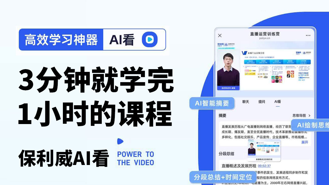 保利威AI看-高效学习神器三分钟掌握一小时课程,快速了学习和复习工具。直播课回复时间太长,如何快回顾课程内容?保利威AI看,高效课程复习与知识回顾,专治学习迷茫,让学习超简单。